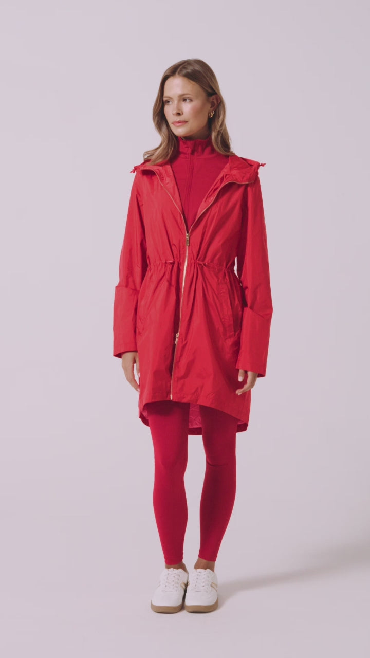 This mid-thigh length raincoat offers a stylish yet practical solution for staying dry all year long. 100% waterproof with an adjustable hood and sleek design, it provides full coverage and comfort while maintaining a flattering silhouette.
